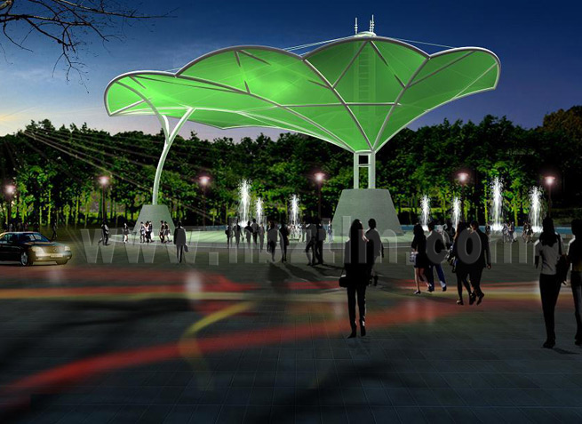 膜材采用PVDF国产或者进口建筑膜材、PTFE玻璃纤维建筑膜材、ETFE透明的永久性建筑膜材;自动放样裁剪,高频焊接,拉伸效果超强,曲线成型可千变万化;膜材质保一般可达15-20年。