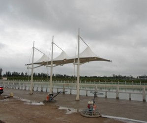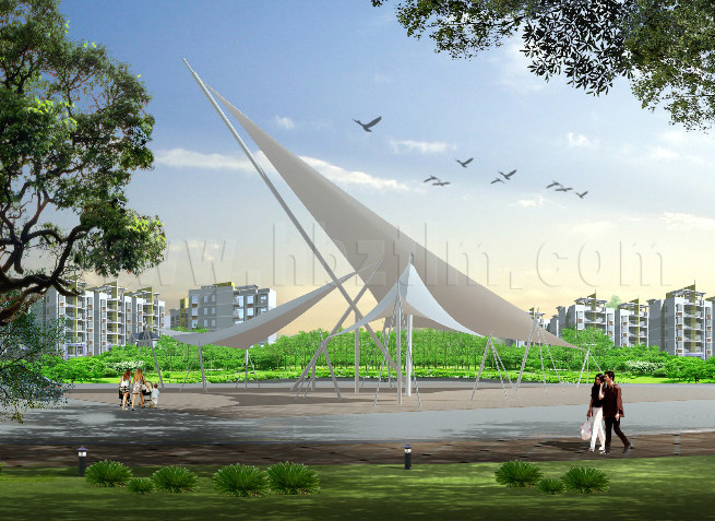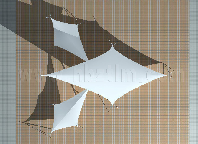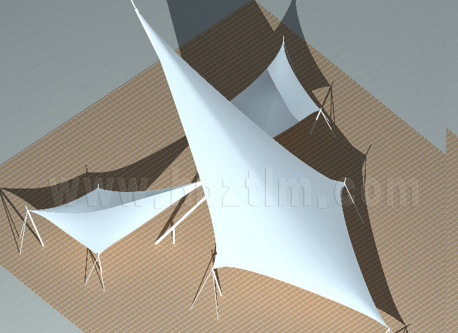 膜材采用PVDF国产或者进口建筑膜材、PTFE玻璃纤维建筑膜材、ETFE透明的永久性建筑膜材;自动放样裁剪,高频焊接,拉伸效果超强,曲线成型可千变万化;膜材质保一般可达15-20年。