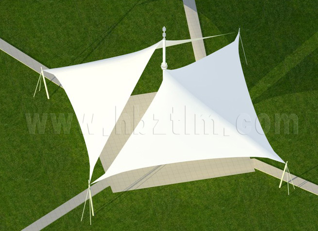 膜材采用PVDF国产或者进口建筑膜材、PTFE玻璃纤维建筑膜材、ETFE透明的永久性建筑膜材;自动放样裁剪,高频焊接,拉伸效果超强,曲线成型可千变万化;膜材质保一般可达15-20年。