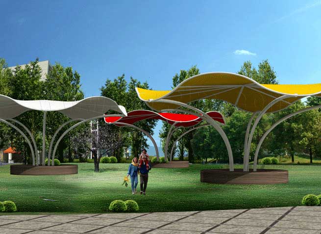 膜材采用PVDF国产或者进口建筑膜材、PTFE玻璃纤维建筑膜材、ETFE透明的永久性建筑膜材;自动放样裁剪,高频焊接,拉伸效果超强,曲线成型可千变万化;膜材质保一般可达15-20年。