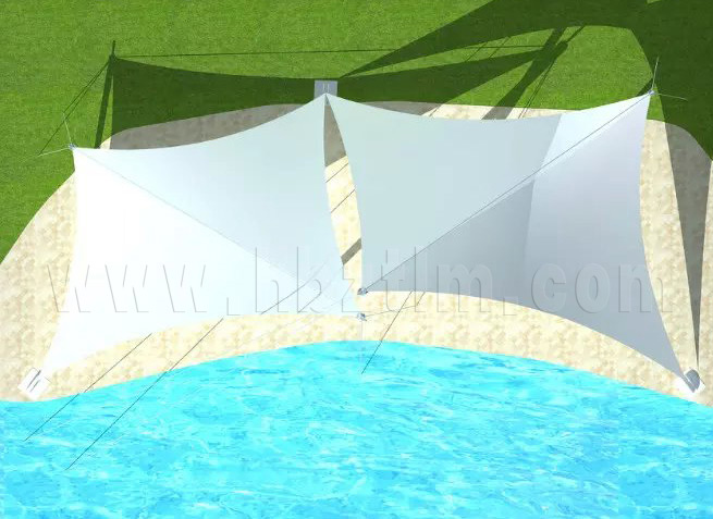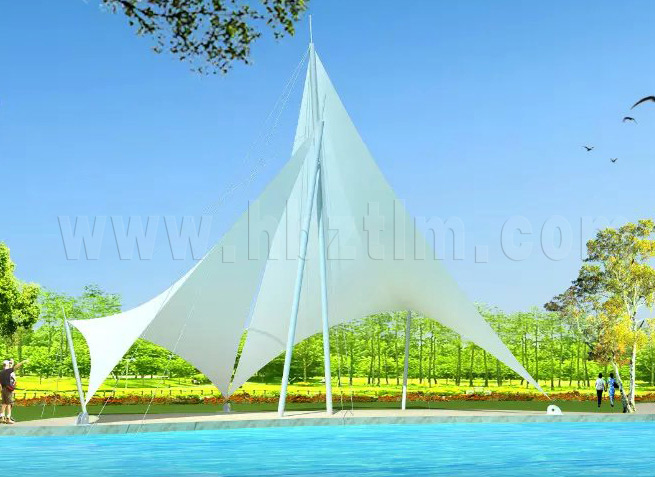 膜材采用PVDF国产或者进口建筑膜材、PTFE玻璃纤维建筑膜材、ETFE透明的永久性建筑膜材;自动放样裁剪,高频焊接,拉伸效果超强,曲线成型可千变万化;膜材质保一般可达15-20年。
