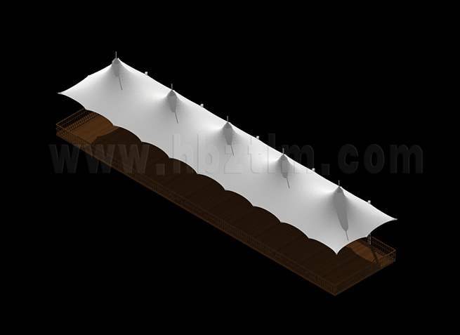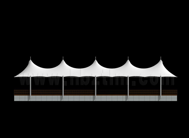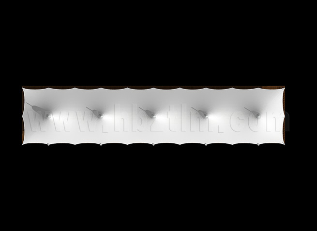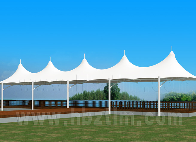膜材采用PVDF国产或者进口建筑膜材、PTFE玻璃纤维建筑膜材、ETFE透明的永久性建筑膜材;自动放样裁剪,高频焊接,拉伸效果超强,曲线成型可千变万化;膜材质保一般可达15-20年。