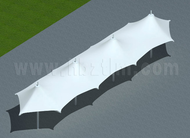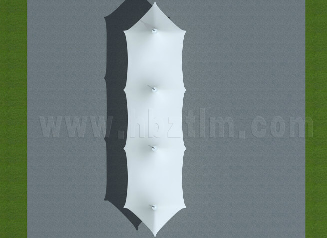 膜材采用PVDF国产或者进口建筑膜材、PTFE玻璃纤维建筑膜材、ETFE透明的永久性建筑膜材;自动放样裁剪,高频焊接,拉伸效果超强,曲线成型可千变万化;膜材质保一般可达15-20年。