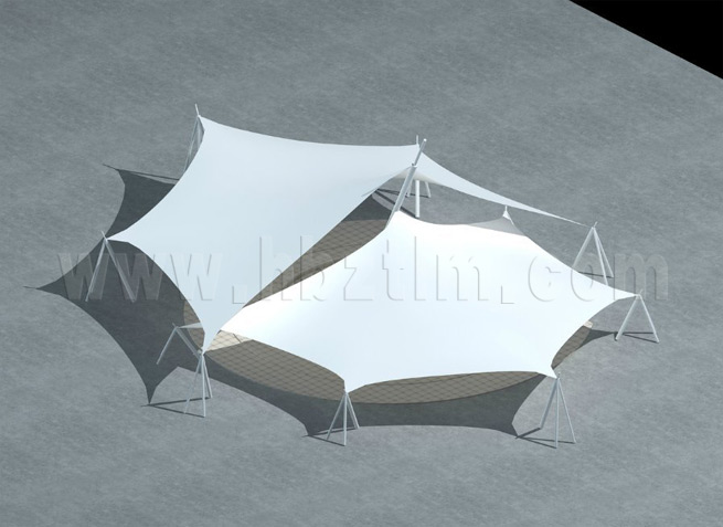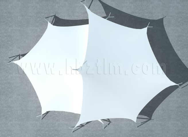 膜材采用PVDF国产或者进口建筑膜材、PTFE玻璃纤维建筑膜材、ETFE透明的永久性建筑膜材;自动放样裁剪,高频焊接,拉伸效果超强,曲线成型可千变万化;膜材质保一般可达15-20年。