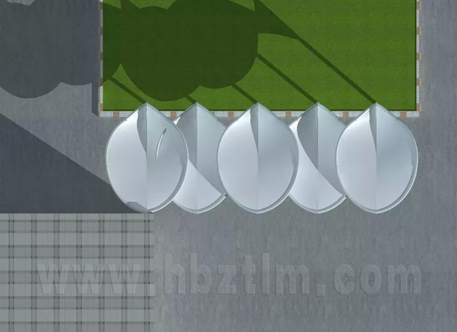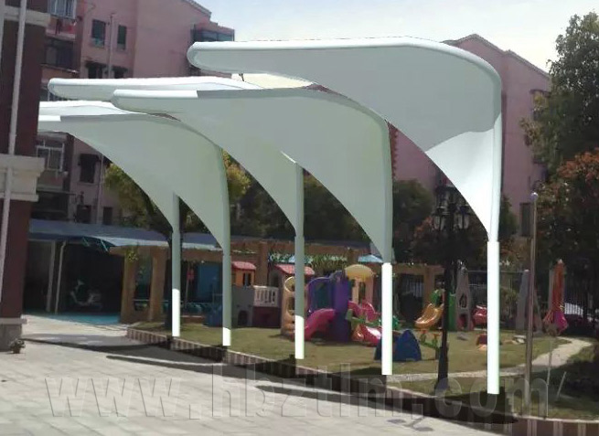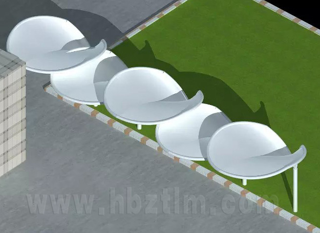 膜材采用PVDF国产或者进口建筑膜材、PTFE玻璃纤维建筑膜材、ETFE透明的永久性建筑膜材;自动放样裁剪,高频焊接,拉伸效果超强,曲线成型可千变万化;膜材质保一般可达15-20年。