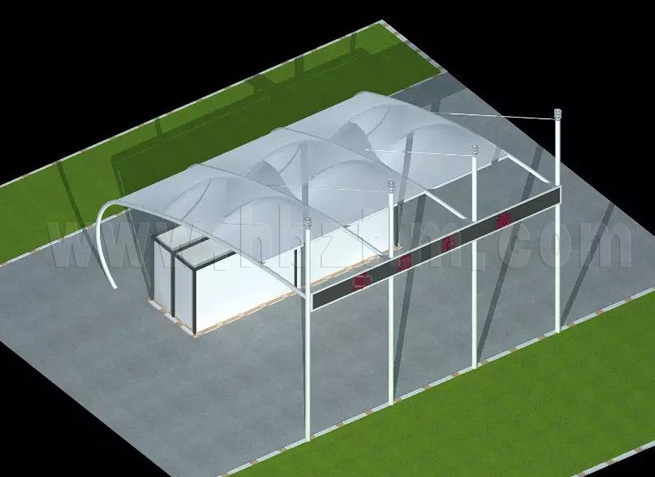 膜材采用PVDF国产或者进口建筑膜材、PTFE玻璃纤维建筑膜材、ETFE透明的永久性建筑膜材;自动放样裁剪,高频焊接,拉伸效果超强,曲线成型可千变万化;膜材质保一般可达15-20年。