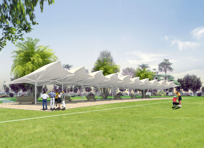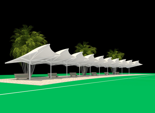 膜材采用PVDF国产或者进口建筑膜材、PTFE玻璃纤维建筑膜材、ETFE透明的永久性建筑膜材;自动放样裁剪,高频焊接,拉伸效果超强,曲线成型可千变万化;膜材质保一般可达15-20年。