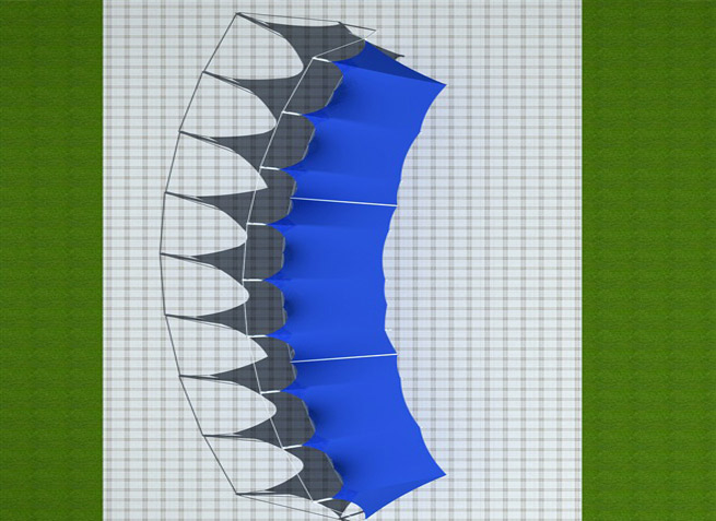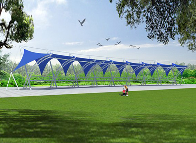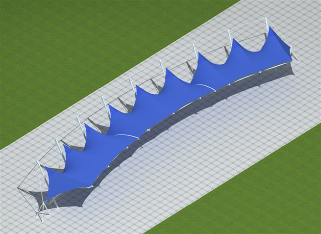 膜材采用PVDF国产或者进口建筑膜材、PTFE玻璃纤维建筑膜材、ETFE透明的永久性建筑膜材;自动放样裁剪,高频焊接,拉伸效果超强,曲线成型可千变万化;膜材质保一般可达15-20年。