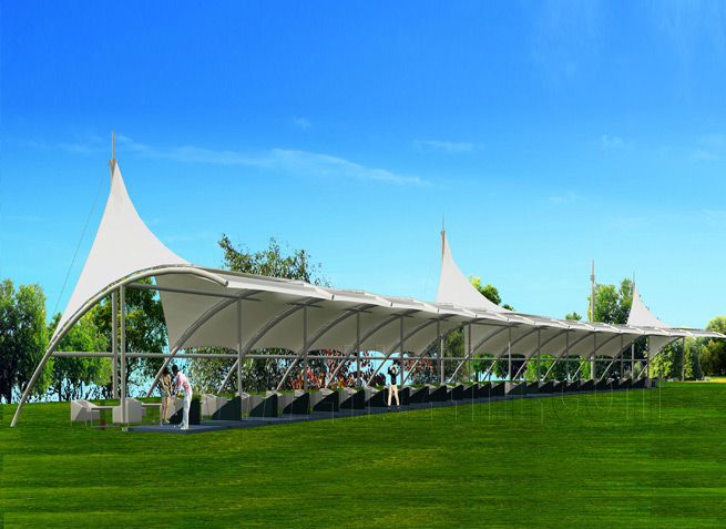 膜材采用PVDF国产或者进口建筑膜材、PTFE玻璃纤维建筑膜材、ETFE透明的永久性建筑膜材;自动放样裁剪,高频焊接,拉伸效果超强,曲线成型可千变万化;膜材质保一般可达15-20年。