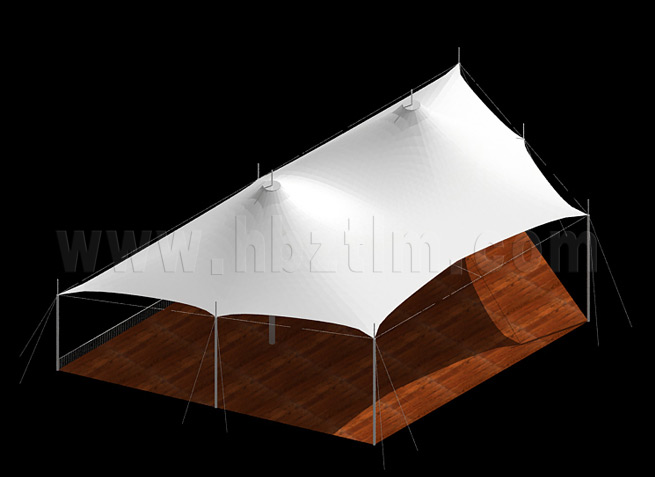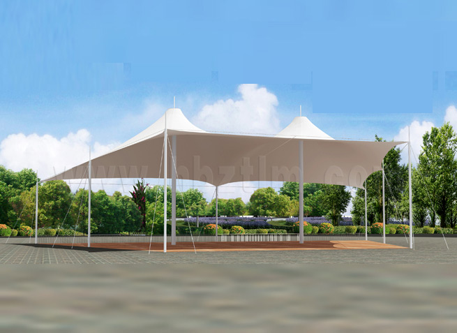 膜材采用PVDF国产或者进口建筑膜材、PTFE玻璃纤维建筑膜材、ETFE透明的永久性建筑膜材;自动放样裁剪,高频焊接,拉伸效果超强,曲线成型可千变万化;膜材质保一般可达15-20年。