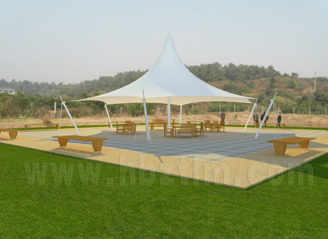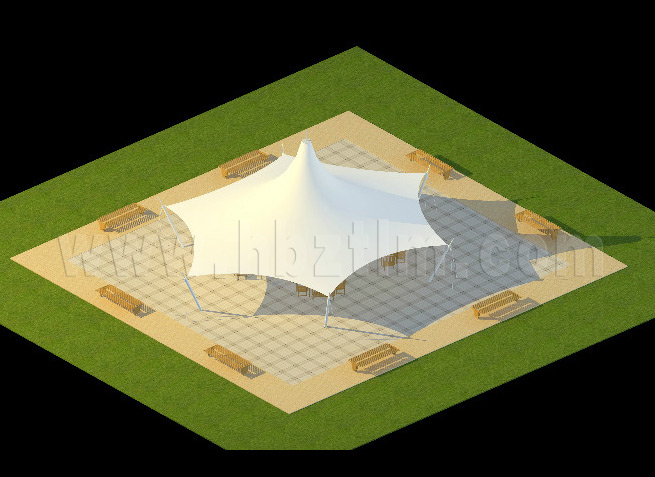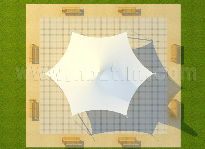 膜材采用PVDF国产或者进口建筑膜材、PTFE玻璃纤维建筑膜材、ETFE透明的永久性建筑膜材;自动放样裁剪,高频焊接,拉伸效果超强,曲线成型可千变万化;膜材质保一般可达15-20年。