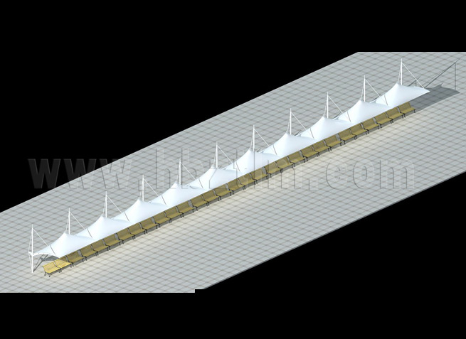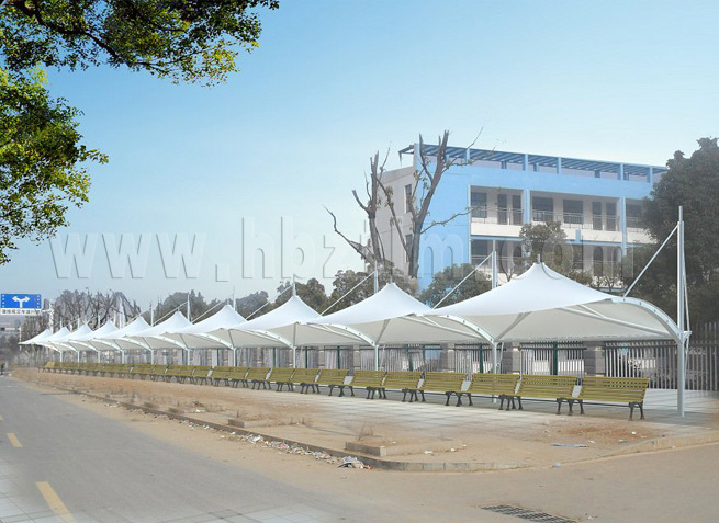 膜材采用PVDF国产或者进口建筑膜材、PTFE玻璃纤维建筑膜材、ETFE透明的永久性建筑膜材;自动放样裁剪,高频焊接,拉伸效果超强,曲线成型可千变万化;膜材质保一般可达15-20年。
