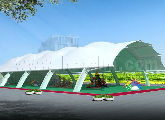 膜材采用PVDF国产或者进口建筑膜材、PTFE玻璃纤维建筑膜材、ETFE透明的永久性建筑膜材;自动放样裁剪,高频焊接,拉伸效果超强,曲线成型可千变万化;膜材质保一般可达15-20年。