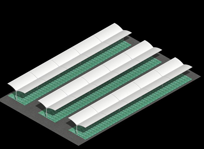 恒天嘉华张拉式冒顶膜结构自行车车棚,本顶目为冒...
