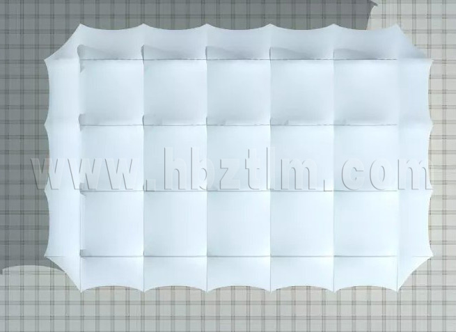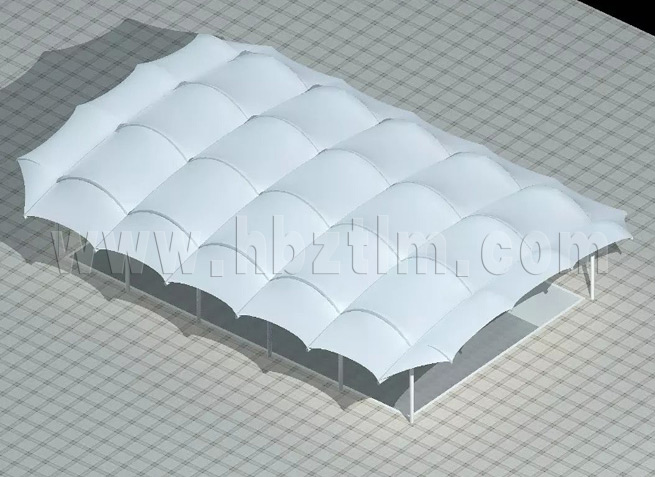 膜材采用PVDF国产或者进口建筑膜材、PTFE玻璃纤维建筑膜材、ETFE透明的永久性建筑膜材;自动放样裁剪,高频焊接,拉伸效果超强,曲线成型可千变万化;膜材质保一般可达15-20年。
