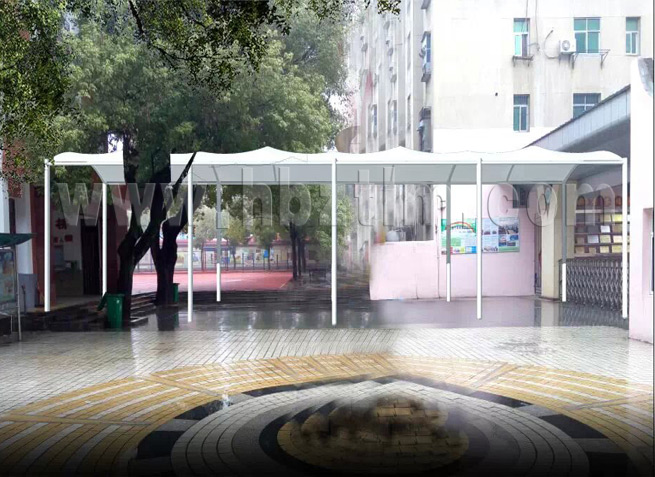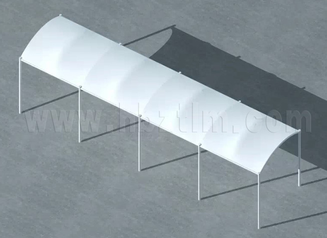 膜材采用PVDF国产或者进口建筑膜材、PTFE玻璃纤维建筑膜材、ETFE透明的永久性建筑膜材;自动放样裁剪,高频焊接,拉伸效果超强,曲线成型可千变万化;膜材质保一般可达15-20年。
