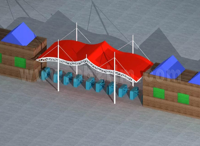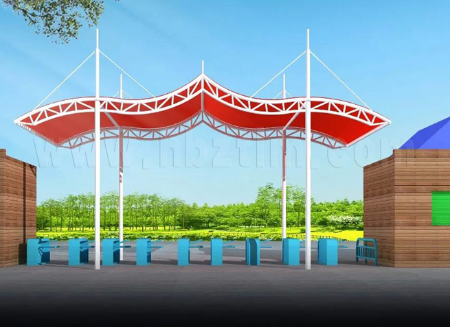 膜材采用PVDF国产或者进口建筑膜材、PTFE玻璃纤维建筑膜材、ETFE透明的永久性建筑膜材;自动放样裁剪,高频焊接,拉伸效果超强,曲线成型可千变万化;膜材质保一般可达15-20年。