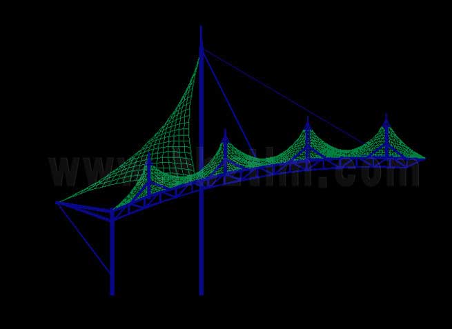 膜材采用PVDF国产或者进口建筑膜材、PTFE玻璃纤维建筑膜材、ETFE透明的永久性建筑膜材;自动放样裁剪,高频焊接,拉伸效果超强,曲线成型可千变万化;膜材质保一般可达15-20年。