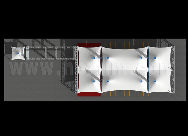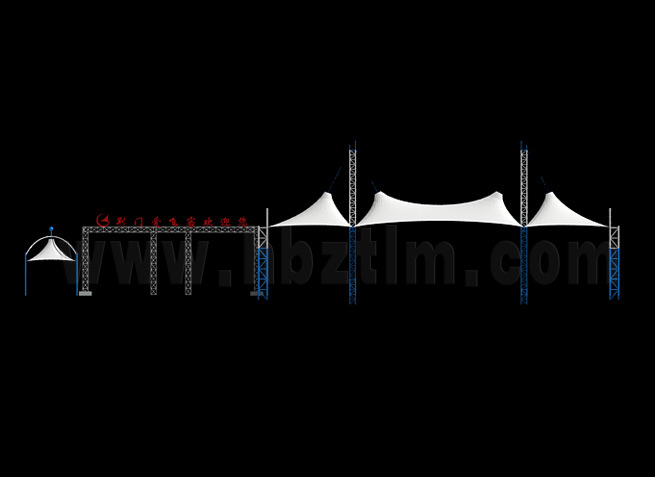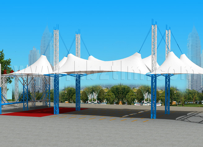 膜材采用PVDF国产或者进口建筑膜材、PTFE玻璃纤维建筑膜材、ETFE透明的永久性建筑膜材;自动放样裁剪,高频焊接,拉伸效果超强,曲线成型可千变万化;膜材质保一般可达15-20年。