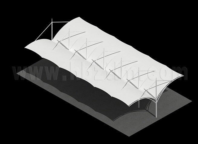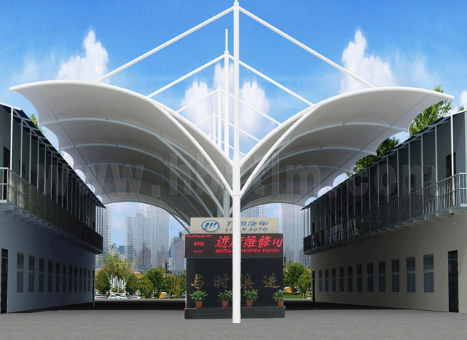 膜材采用PVDF国产或者进口建筑膜材、PTFE玻璃纤维建筑膜材、ETFE透明的永久性建筑膜材;自动放样裁剪,高频焊接,拉伸效果超强,曲线成型可千变万化;膜材质保一般可达15-20年。