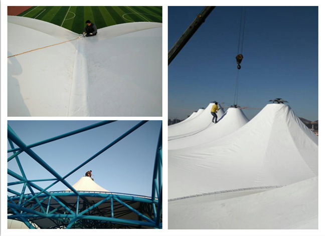 图3 辽宁财贸学院体育看台膜结构拉膜现场施工照片