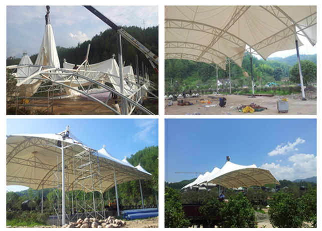图2 江西南昌风景区网球场顶棚膜结构拉膜现场施工照片