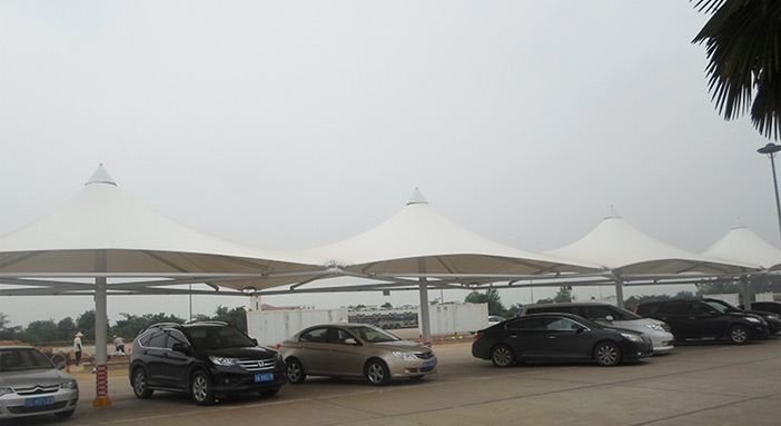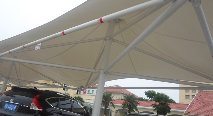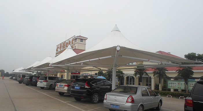 G4高速湖北孝感景观停车棚膜结构,该项目为景观性停车棚膜结构,采用连帽顶全软边张拉形式,美观而实用,冒顶还做了特殊精工装饰处理,整个结构高度达到了6米,单车位投影也达到3米×6米,实为大气。该项目采用PVDF白色车棚专用建筑膜材,整体结构从设计到施工,都精工细作,臻至完美。