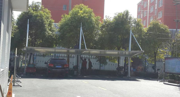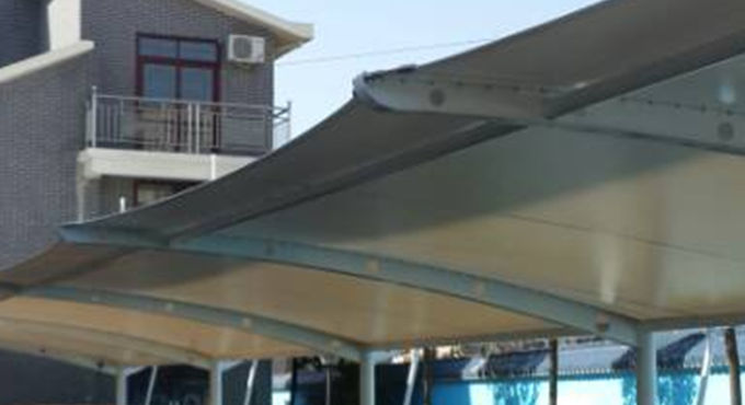 仙桃地税局吊塔式异形钢膜结构停车棚,本项目采用前软边后硬边张拉形式;结构由立柱、拉杆、挑梁、横杆构成,其挑梁和中间横杆一般采用异形钢挑梁形式,美观而不积水且抗负荷能力强;膜材采用ZZF白色建筑膜材,15年质保,整体结构美观实用,经济牢固,臻至完美。