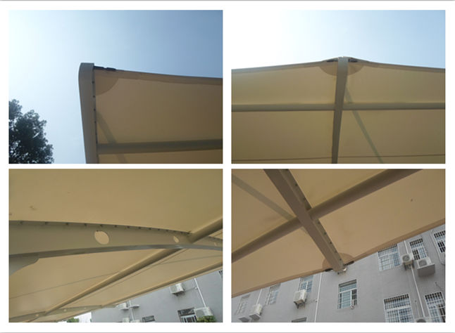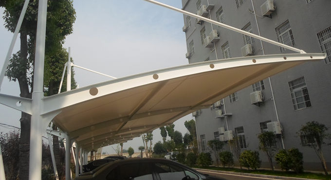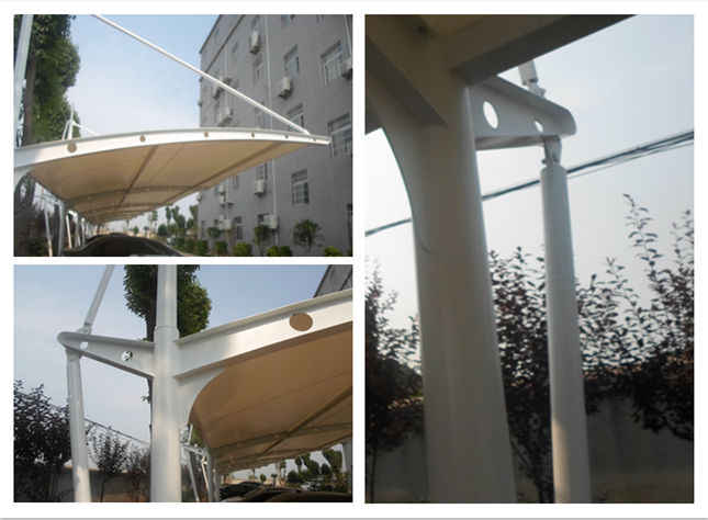 黄陂祁家湾镇吊塔式异型钢膜结构车棚,本项目采用前软边后硬边张拉形式;结构由立柱、拉杆、挑梁、横杆构成,其挑梁和中间横杆一般采用异形钢挑梁形式,美观而不积水且抗负荷能力强;膜材采用PVDF白色车棚专用建筑膜材,15年质保,整体结构美观实用,经济牢固,臻至完美。