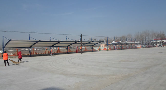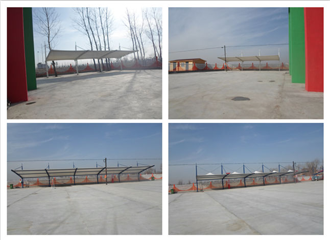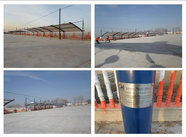辽宁盘锦七彩庄园吊塔式异形钢膜结构车棚,本项目采用前软边后硬边张拉形式;结构由立柱、拉杆、挑梁、横杆构成,其挑梁和中间横杆一般采用异形钢挑梁形式,美观而不积水且抗负荷能力强;膜材采用ZZF白色建筑膜材,15年质保,整体结构美观实用,经济牢固,臻至完美。