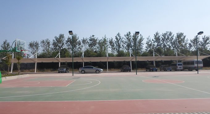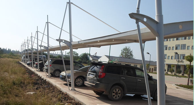 恒天嘉华吊塔式异形钢膜结构车棚,本项目采用前软边后硬边张拉形式;结构由立柱、拉杆、挑梁、横杆构成,其挑梁和中间横杆一般采用异形钢挑梁形式,美观而不积水且抗负荷能力强;膜材采用ZZF白色建筑膜材,15年质保,整体结构美观实用,经济牢固,臻至完美。