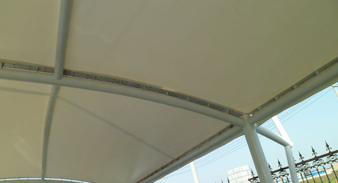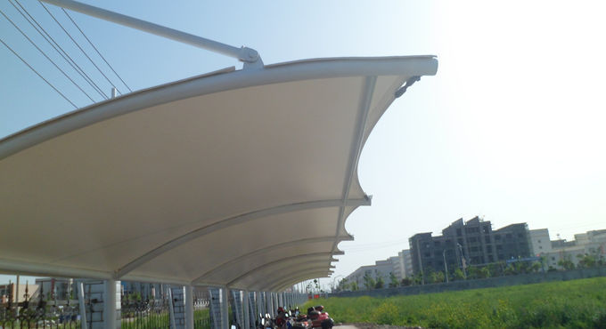湖北美味源公司吊塔式圆管膜结构自行车车棚,本项目采用前软边后硬边张拉形式,结构由立柱、拉杆、挑梁、横杆构成,其挑梁和中间横杆一般采用弧管形式,美观而不积水且抗负荷能力强;膜材采用ZZF白色建筑膜材,15年质保,整体结构美观实用,经济牢固,臻至完美。