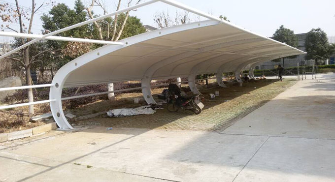随州市审计局异型钢膜结构汽车车棚,本项目采用前软边后硬边张拉形式;结构由立柱、拉杆、挑梁、横杆构成,其挑梁和中间横杆一般采用异形钢挑梁形式,美观而不积水且抗负荷能力强;膜材采用ZZF白色建筑膜材,15年质保,整体结构美观实用,经济牢固,臻至完美。