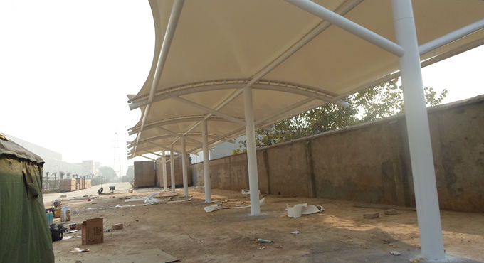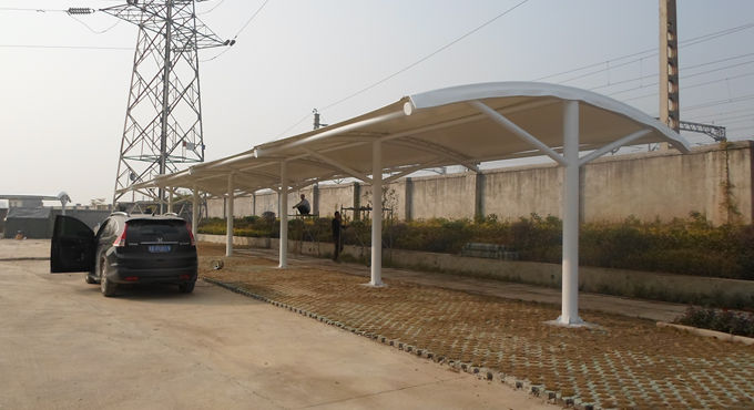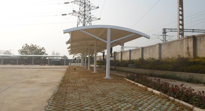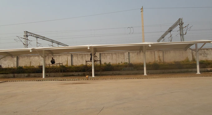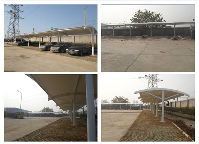 五子沟武汉机床厂T型圆管膜结构车棚,本项目采用前软边后硬边张拉形式,结构由立柱、拉杆、挑梁、横杆构成,其挑梁和中间横杆一般采用弧型圆管挑梁形式,美观而不积水且抗负荷能力强;膜材采用ZZF白色建筑膜材,15年质保,整体结构美观实用,经济牢固,臻至完美。