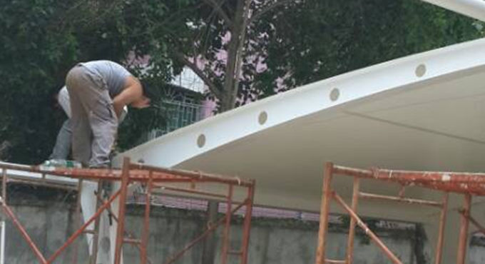 韶关气象局L型异形钢膜结构车棚,本项目采用前软边后硬边张拉形式;结构由立柱、拉杆、挑梁、横杆构成,其挑梁和中间横杆一般采用异形钢挑梁形式,美观而不积水且抗负荷能力强;膜材采用PVDF白色车棚专用建筑膜材,15年质保,整体结构美观实用,经济牢固,臻至完美。