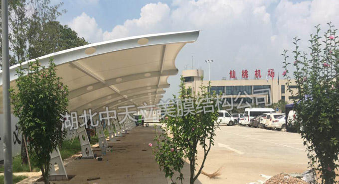 仙桃机场是全国第一家标准化通用航空机场,是国网通用航空公司三大区域中心基地之一;这次选择与中天立美膜结构公司合作膜结构车棚项目,本次膜结构车棚项目共两处地方施工,一个膜结构小车车棚,一个膜结构自行车棚;该项目膜材采用PVDF建筑膜材,膜材自洁性高,经久耐用。
