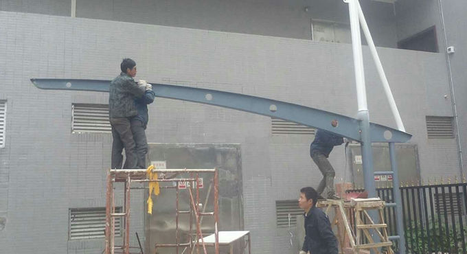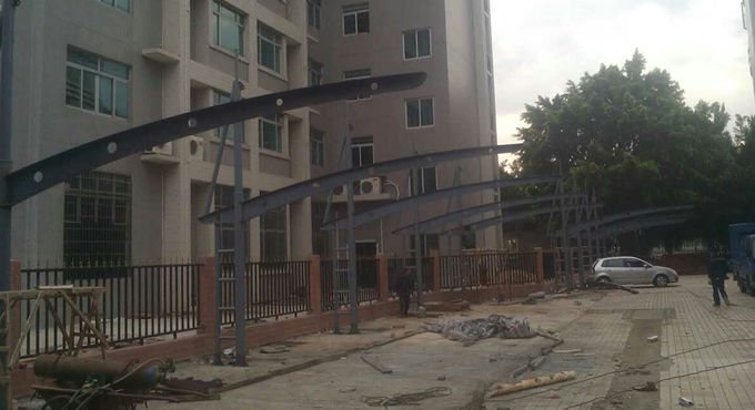 韶关质监局异形钢平弧膜结构停车棚,本项目采用前软边后硬边张拉形式;结构由立柱、拉杆、挑梁、横杆构成,其挑梁和中间横杆一般采用异形钢挑梁形式,美观而不积水且抗负荷能力强;膜材采用PVDF白色车棚专用建筑膜材,15年质保,整体结构美观实用,经济牢固,臻至完美。