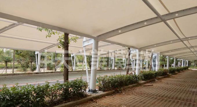 此次膜结构车棚项目现场环境特殊,在不破坏园区绿化环境之外,将基础下在绿化带里,再结合现场环境采用了吊塔式膜结构车棚样式,使用PVDF膜材,车棚共做两排,总面积达739平方。