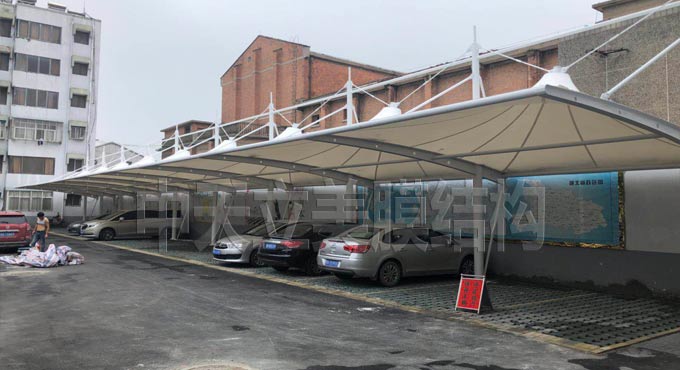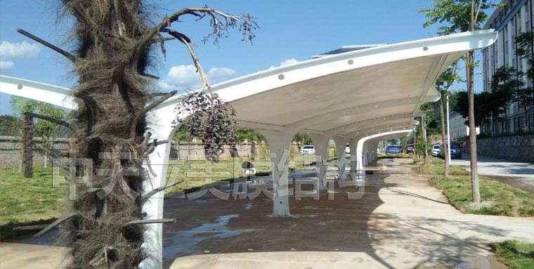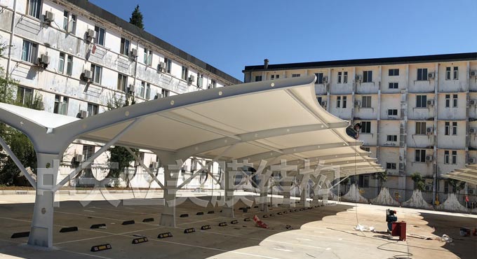 该膜结构车棚项目采用的是帽顶张拉式膜结构车棚样式,这次膜结构...