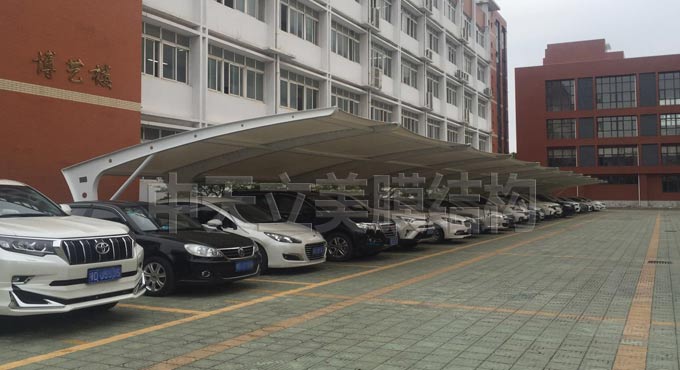 荆州江陵县实验高中与中天立美膜结构公司签定膜结构停车棚项目已顺利完工;该项目客户选择L型膜结构停车棚样式 ,我公司设计部在老版L型膜结构停车棚样式的基础上加以改良,立柱中间加一根撑杆,加固钢结构,这样膜结构停车棚在大风大雪天气也不用担心,放心安全使用。