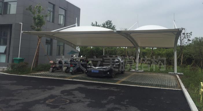 此次膜结构车棚项目现场环境特殊,在不破坏园区绿化环境之外,将基础下在绿化带里,再结合现场环境采用了吊塔式膜结构车棚样式,使用PVDF膜材,车棚共做两排,总面积达...