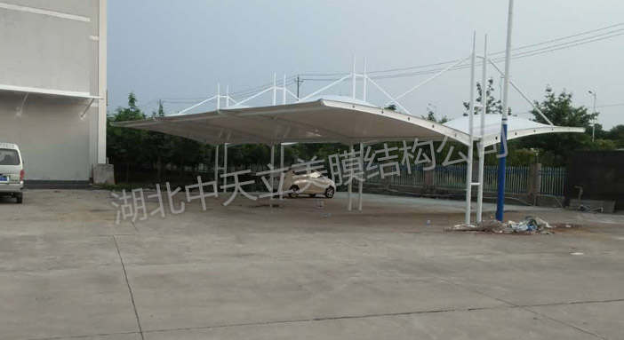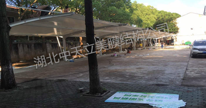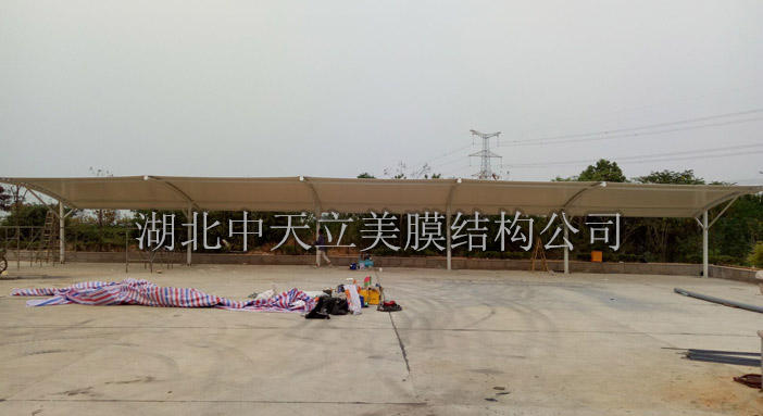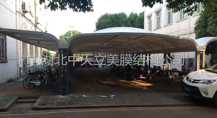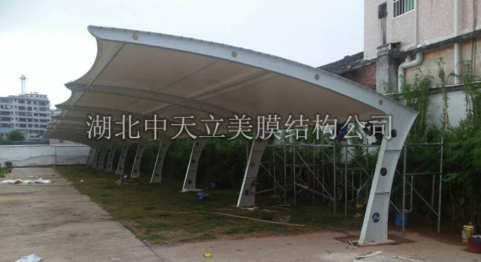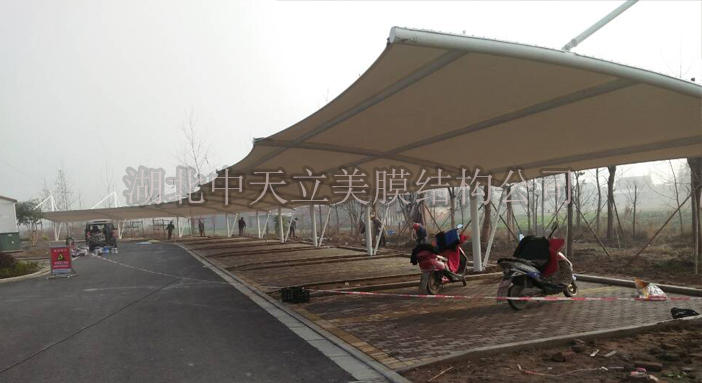 湖北泰盟电气公司与中天立美膜结构公司签订膜结构车棚及膜结构自行车棚项目,这次膜结构车棚客户选用双挑异型钢吊塔式膜结构车棚样式,整体造型美观,大方,实用,是很多客户首选车棚样式之一。