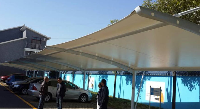 仙桃地税局吊塔式异形钢膜结构停车棚,本项目采用前软边后硬边张拉形式;结构由立柱、拉杆、挑梁、横杆构成,其挑梁和中间横杆一般采用异形钢挑梁形式,美观而不积水且抗负荷能力强;膜材采用ZZF白色建筑膜材,15年质保,整体结构美观实用,经济牢固,臻至完美。