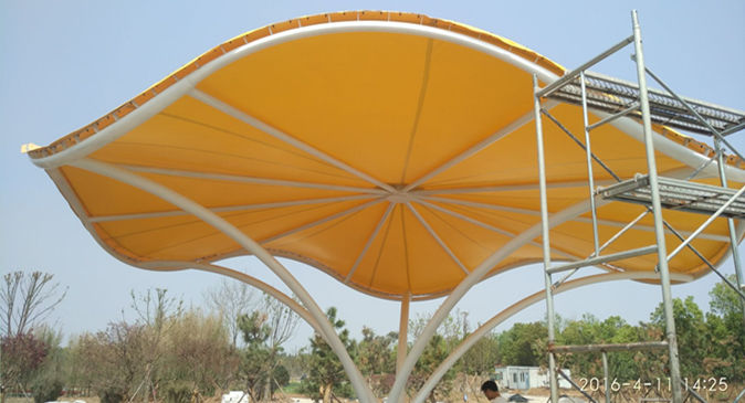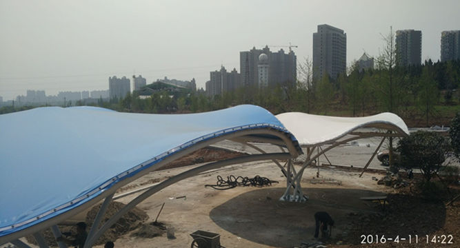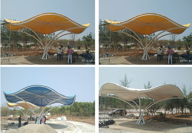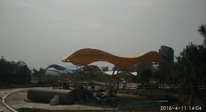 荆门市千佛洞植物园一期二标园林景观膜结构工程,该项目结构以荷叶的外形为基本参照设计,全弧管结构拼装,做工精细,整体流线型的外形和建筑膜材全硬边式张拉给人以刚柔之美,为了丰富其视角效果,我们采用了彩色建筑膜以示渲染,作为公园的休闲景观,既给人以纳凉之处,又给整体环境以时尚现代之美。此类结构被广泛应用于公园、江河湖畔、广场、景区等。