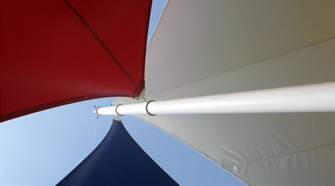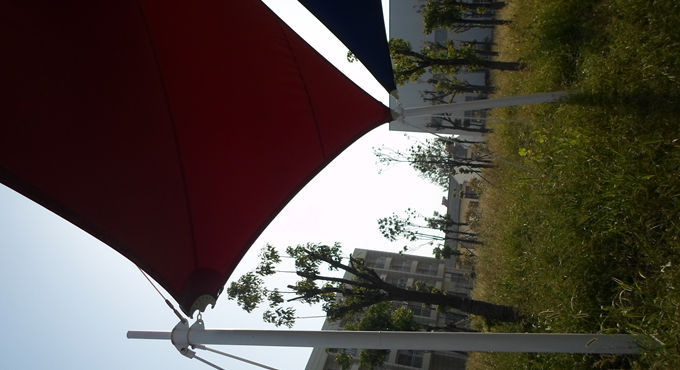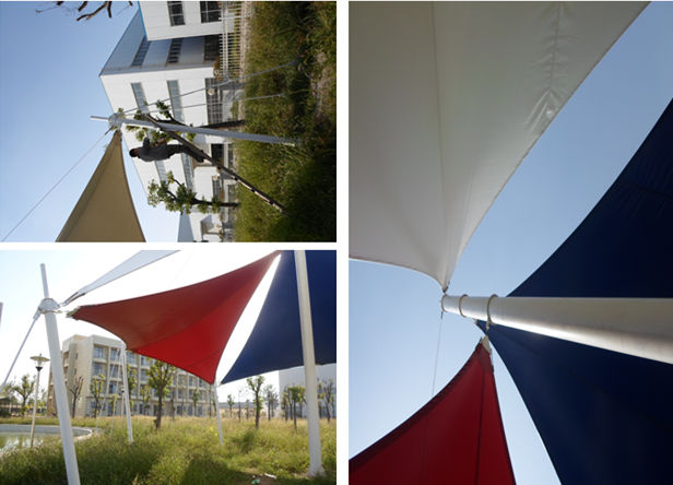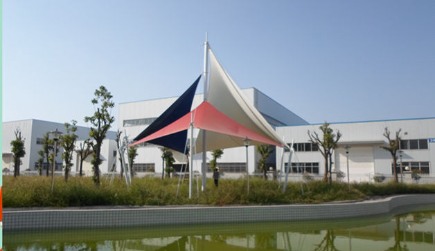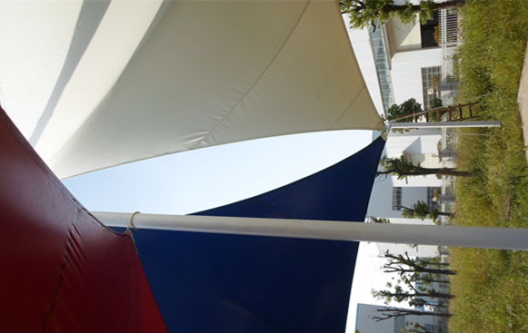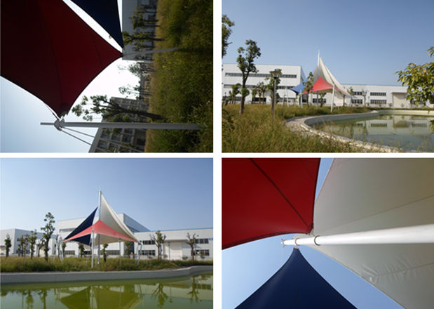 恒天嘉华景观张拉膜结构工程,该项目是典型的景观张拉膜结构,俗称飞燕。膜材采用红白蓝三种颜色膜材组成,色彩鲜明;其结构以钢柱为受力支撑点,全软边钢索预应力张拉成型,各环节制作安装精度要求极高,整体结构轻盈而优美,既有钢柱、钢索牵引的力量之美,又有pvdf建筑膜材的柔性曲线之美,大气、时尚、牢固实用,刚与柔完美融合,因其亮丽色彩,成为单位一道独特的风景。