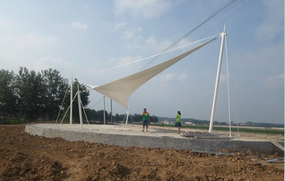 老河口市军用机场观景台张拉膜结构,其结构以钢柱为受力支撑点,全软边钢索预应力张拉成型,各环节制作安装精度要求极高,整体结构轻盈而优美,既有钢柱、钢索牵引的力量之美,又有pvdf建筑膜材的柔性曲线之美,大气、时尚、牢固实用,刚与柔完美融合,堪称典型景观膜结构造型。