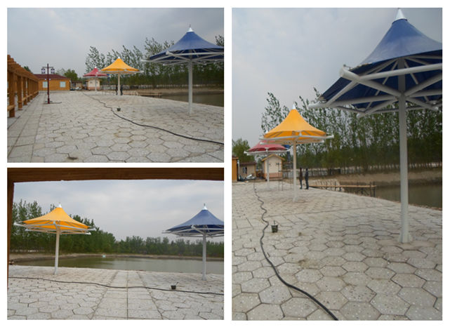 辽宁七彩庄园张拉膜结构景观伞,该项目为永久式景观遮阳伞,其结构为内撑式冒顶膜结构,单帽单立柱支撑,该项目每个都为单个帽顶形式,pvdf建筑膜材裁剪为整张设计张拉,对施工工艺、精度要求高,这种结构是很多景观遮阳项目的选择,其尺寸不受限制,可大可小,可单冒顶,也可无限连帽,为了结构的完美,冒顶装饰可根据现场环境和结构需要设计,该冒顶采用立杆圆盘差异性设计,美观而实用。