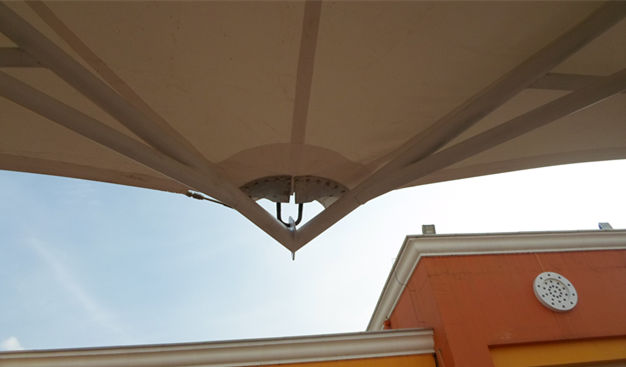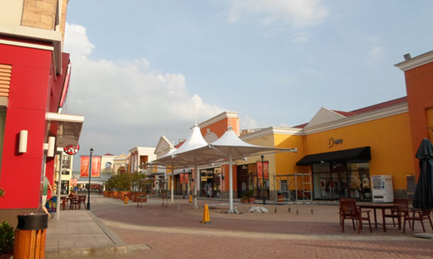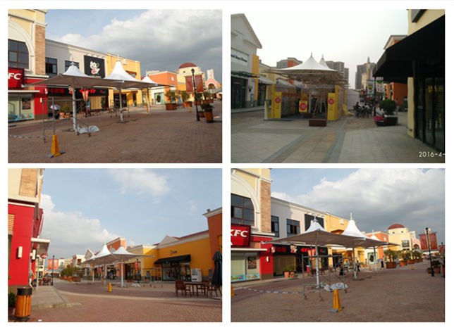 图3 百联奥特莱斯三连帽休闲景观遮阳伞膜结构现场成品图