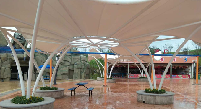 荆门市欢乐世界景观膜结构,该项目结构以荷叶的外形为基本参照设计,全弧管结构拼装,做工精细,整体流线型的外形和建筑膜材全硬边式张拉给人以刚柔之美,为了丰富其视角效果,我们采用了彩色建筑膜以示渲染,作为公园的休闲景观,既给人以纳凉之处,又给整体环境以时尚现代之美。此类结构被广泛应用于公园、江河湖畔、广场、景区等。