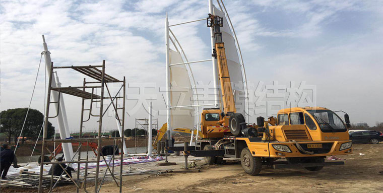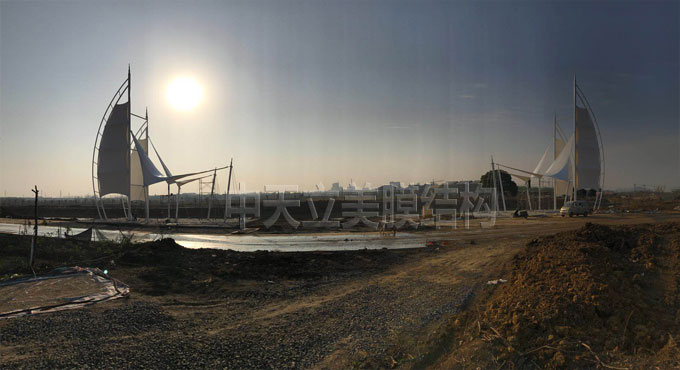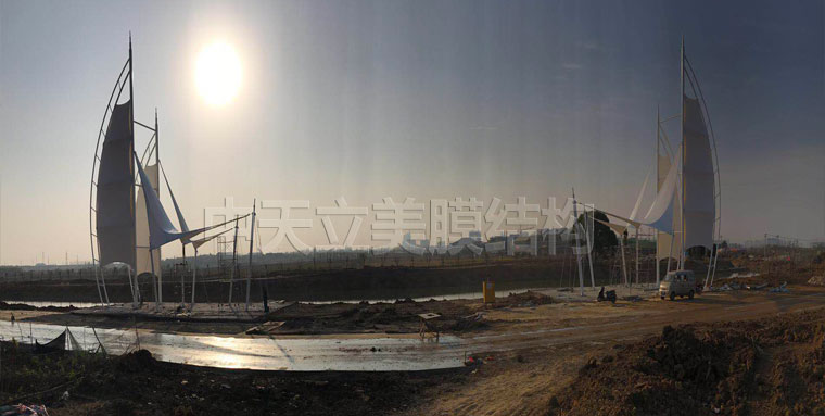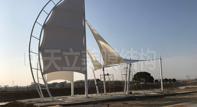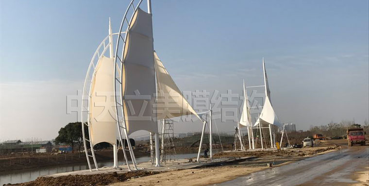 孝昌凤凰天仙城与湖北中天立美膜结构公司签定一帆风顺景观膜结构项目,该项目为一帆风顺景观膜定制,我们的膜结构设计师结合现场环境给客户设计出了"一帆风顺"造型,甲方确认非常满意,该景观膜结构整体长22米,高22米,宽7米,相同景观膜结构造型共2组.